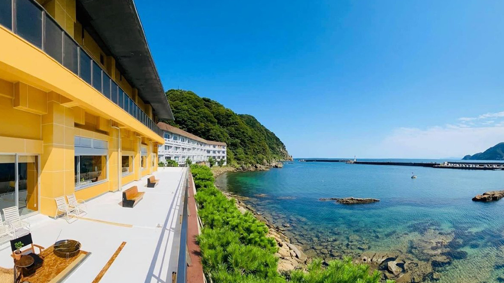 竹野浜海水浴場からも近く全室がオーシャンビュー。モダンでアートな和室も楽しい滞在を演出してくれる。冬のカニ料理も好評。(全7室)